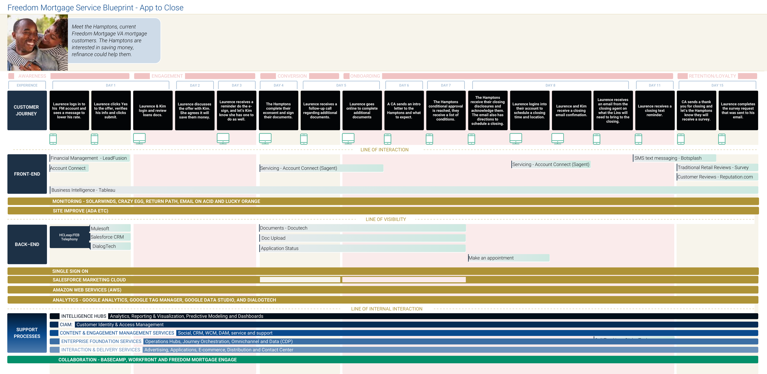 To bridge fragmented systems and align executive stakeholders, I led the development of a comprehensive service blueprint that mapped the end-to-end mortgage experience.