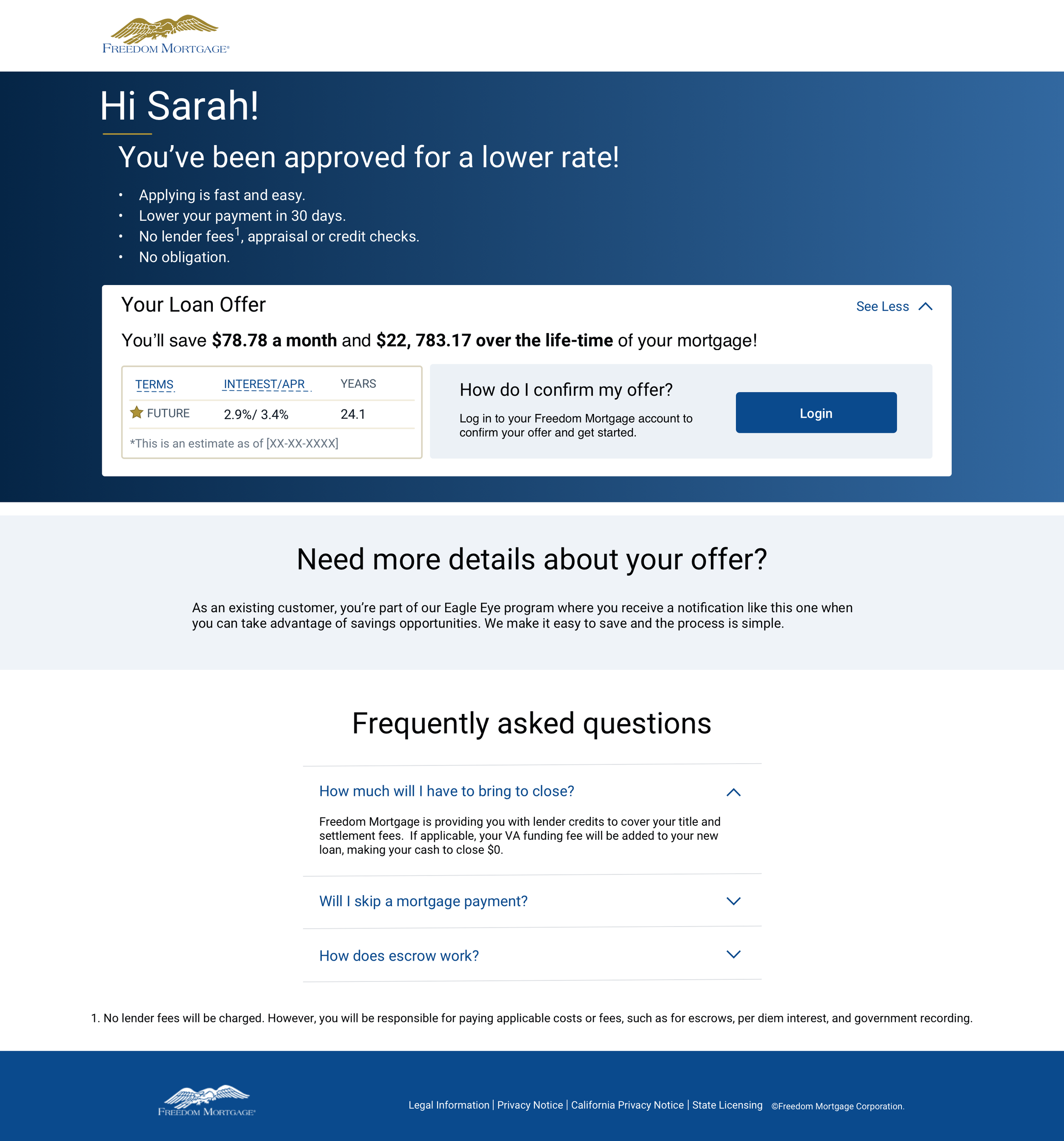 At Freedom Mortgage, I led strategy, research, and design for a self-service mortgage experience that improved user clarity and reduced friction across the loan journey. By redesigning the application and integrating proactive refinance tools, we generated $9.2M in revenue, cut call times by 50%, accelerated loan closures, and strengthened competitiveness against digital-first lenders like Rocket Mortgage.