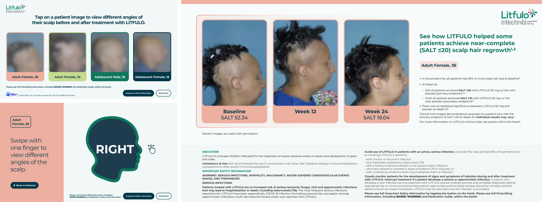 Users engaged with interactive before-and-after patient imagery, allowing them to explore different scalp angles and visualize hair regrowth over time with Litfulo treatment. This experience reinforced clinical efficacy and supported stronger prescriber confidence.